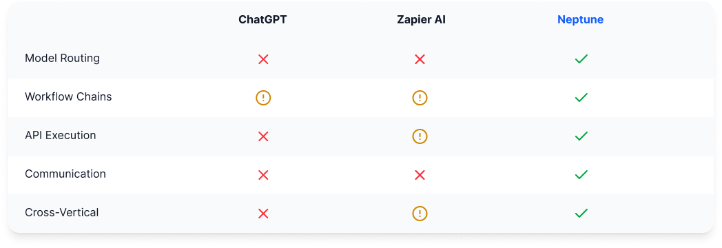 Neptune is an AI-native orchestration platform that intelligently routes and chains multiple AI models and vertical APIs into autonomous workflows, while integrated communication agents execute and communicate outcomes across channels.